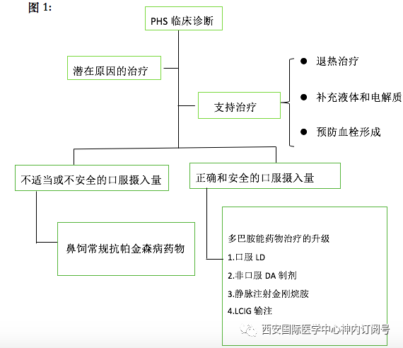 早期诊断是必不可少的。除了寻找和纠正潜在的原因外,左旋多巴也是其管理的核心。如果该综合征是由多巴胺能治疗剂量减少引起的,应立即恢复先前的方案,口服左旋多巴剂量并逐渐加量。在有吞咽问题的患者中,鼻饲可以促进多巴胺能治疗疗效。如果增加左旋多巴剂量失败,值得尝试阿扑吗啡(间歇注射或连续输注)、罗替戈丁透皮贴剂、静脉注射硫酸金刚烷胺(仅在德国,奥地利和匈牙利可用)。最难治的病例可考虑左旋多巴-卡比多巴凝胶鼻饲滴定给药。其他的治疗方法,如口服丹曲林和口服溴隐亭是推荐的,但没有确切的证据证明疗效。皮质类固醇治疗(每天1g甲基强的松龙,直到症状的改善)可能会有所帮助,但只有有限的证据证明其有效性。一些患者需要进入重症监护病房入院治疗,以便密切监测生命体征以及给予生命支持治疗,如退热治疗,补充液体和电解质,以及预防性应用抗凝药物治疗。患者需要常规检查血清肌酶,肾功能(以确定有无恶化)和凝血功能。(图1)早期治疗通常预后良好,尽管许多患者没有恢复到他们以前基线水平功能。