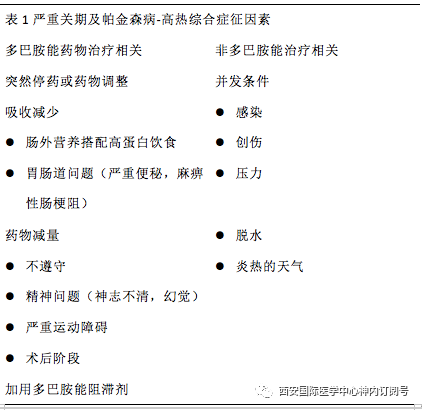 一些患者出现急性“运动发作”(称为帕金森病-高热综合征),这是一种严重的并发症,发病率为0.3%,死亡率为4%。它可能伴随着多巴胺能药物的突然变化,可能还有各种其他的诱发因素(表1)。