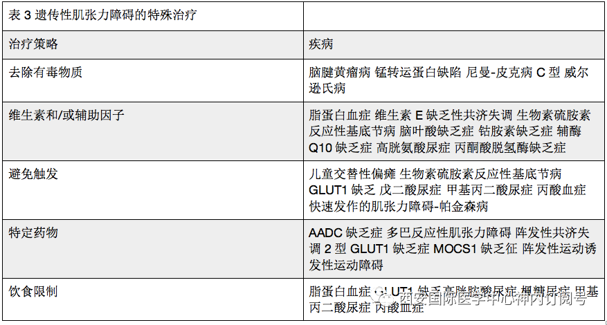尽管许多针对特定形式的肌张力障碍的特殊治疗都集中于多巴反应性肌张力障碍和威尔逊氏病,但选项要多得多。最近的一篇综述描述了超过30种通过疾病特异性疗法治疗的遗传性疾病,其中超过一半的疾病包括肌张力障碍,无论是单独发生还是作为多系统疾病的一部分。此处仅列举出几个例子,表3列出了这些疾病的更完整列表及其治疗方法。例如,可以通过补充维生素或必需的辅因子来治疗通常在儿童早期肌张力障碍中作为多系统综合征的一部分出现的几种疾病。还包括对生物素-硫胺素有反应的基底神经节疾病,生物素酶缺乏症和维生素E缺乏共济失调。其他疾病可以通过饮食改变来控制。包括GLUT1缺乏综合征,枫糖尿症和脂蛋白缺乏症。阵发性运动诱发性运动障碍的肌张力障碍性痉挛对低剂量的卡马西平及相关抗惊厥药反应特别好。尽管所有这些疾病都很罕见,但早期诊断至关重要,因为治疗可能会改变生活。对于许多人而言,晚期诊断可能会导致不可逆的神经系统缺陷。