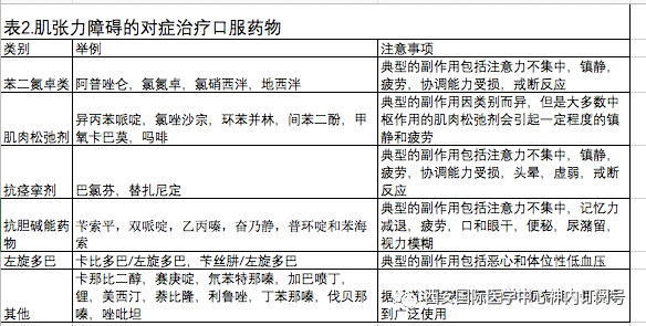 肌张力障碍患者可选择多种治疗药物。基于证据的综述已经发表,但是可用的药物均未进行严格的对照临床试验进行测试。它们的使用很大程度上是由临床经验和专家意见驱动的。可用的治疗选择分为2大类。这些药物包括对许多类型的肌张力障碍有用的对症治疗药物(表2)和仅在特殊情况下有用的药物(表3)。