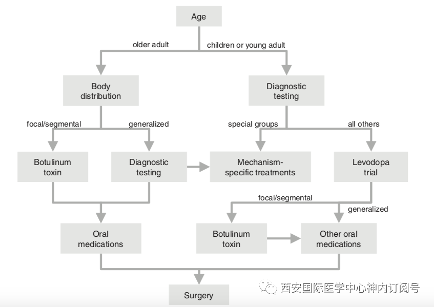 由于肌张力障碍的显著异质性,描述用于解决所有肌张力障碍的通用方法的简单流程很难构建。但是,可以提供一些通用原理的基本方法(图3),但要注意的是,必须根据具体情况进行实际管理。全面的诊断评估是一个重要的起点,包括注意与临床分类相关的所有四个因素。这些因素包括发病年龄,受影响的身体部位,时间特征和相关特征。发病年龄起重要作用,对于大多数成年人,肌张力障碍是特发性的,因此通常不进行广泛的诊断测试。相反,治疗方法更多地取决于身体分布,对于局灶性和节段性肌张力障碍,BoNT是首选治疗方法,有时辅助口服药物治疗,尤其是随着时间的推移存在对BoNT周期性低谷反应。当BoNT加口服制剂效果不佳时,应考虑使用DBS。在成年人中,全身性肌张力障碍并不常见,因此可能需要通过脑部MRI进行一些其他诊断测试。BoNT很少能满足需要,因此口服制剂和DBS扮演着更重要的角色。