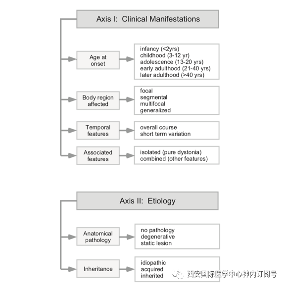 (按轴2分类。轴1与临床表现有关。临床分类的主要因素包括发病年龄、体位分布、时间特征、肌张力障碍是否与其他神经或医学问题相关。病因分类的主要因素包括该疾病是否与相关的脑组织病理有关,以及该疾病是后天或遗传的。然而,很大一部分病例仍然是特发性的。)
