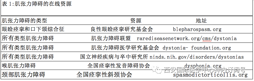 心理咨询很重要,原因有3个。首先,许多肌张力障碍患者经历了一场艰苦的诊断之旅,他们在几年里向多个医生描述了自己的症状,却没有得到明确的诊断。他们经常尝试多种治疗方法,但收效甚微或毫无益处。这个过程给人的印象是他们患有一些不可治愈的神秘疾病。一些咨询有助于解决这种不正确的印象。可以将患者引导至多个在线资源以获取更多信息(表1)。
