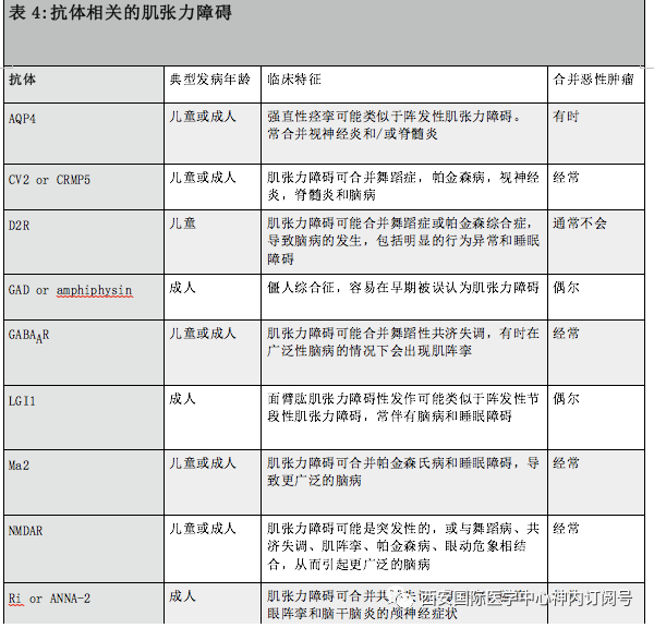 可治疗的肌张力障碍的另一类包括自身免疫性疾病,其中一些具有可识别的抗体(表4)。最著名的例子之一是Sydenham氏舞蹈病,舞蹈病通常为主要表现。但是,许多患有Sydenham舞蹈病的儿童也有肌张力障碍姿势,肌张力障碍可能是主要问题,抗菌治疗很重要。对于大多数其他疾病,肌张力障碍通常是多系统疾病的一部分,有时会合并脑病。 再一次强调,早期诊断是有价值的,因为许多与潜在的恶性肿瘤有关。恶性肿瘤的治疗至关重要,有时可联合免疫调节剂。