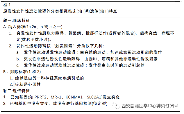 PxD的临床分类主要基于Demirkiran和Jankovic(1995)提出的标准,随后在2004年由Bruno和同事们对其进行了改进。这种分类依赖于诱发事件,诱发事件被认为是临床病程和潜在遗传原因的最佳预测因素。根据诱发因素,PxD可分为PKD、PNKD或PED,二级分类是基于发作的持续时间。最后,三级分类包括假定的病因:原发性(家族性/散发性)或继发性(表1)。最近,Erro和他的同事在2014年提出了一种新的PxD分类方案,包括前面提到的所有分类以及最近的基因发现。这种新分类包括两个轴:临床特征(轴1)和遗传决定因素(轴2),如框1所示。