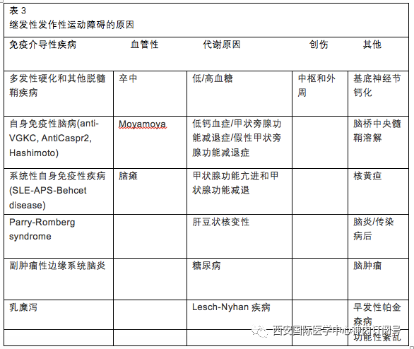 缩写:APS:抗磷脂综合征; SLE:系统性红斑狼疮; VGKC:电压门控钾通道复合体。缩写:CBZ:卡马西平,PKD:发作性运动诱发性运动障碍,PNKD:发作性非运动诱发性运动障碍