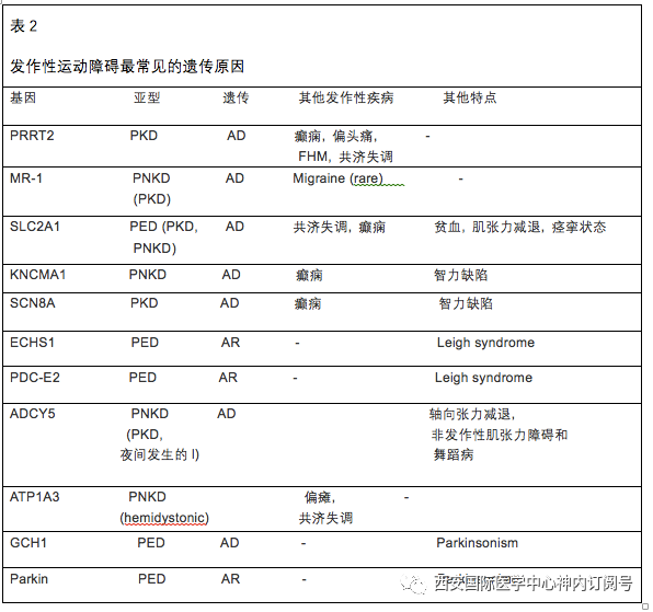 缩写词:AD:常染色体显性遗传;AR:常染色隐性遗传;FHM:家族性偏瘫性偏头痛;PDC:丙酮酸脱氢酶复合体;PED:发作性过度运动诱发性运动障碍;PKD:发作性运动诱发性运动障碍;PNKD:发作性非运动诱发性运动障碍。