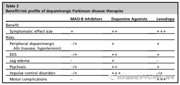 几项随机对照试验表明,与左旋多巴单药治疗相比,长达5年时间的DAs早期单药治疗发生运动障碍的风险明显更低,这使得很多学者建议在早期使用左旋多巴保护策略(DAs或MAO-B抑制剂),后期考虑使用左旋多巴辅助治疗,以更好的改善症状。不幸的是,这些试验结果和实践建议似乎被患者和医生曲解,这也导致了“左旋多巴恐惧”的现象-尽管很多患者的临床症状需要更好的控制,但药物的使用仍有所保留。最近在一项涉及1600多名早期帕金森病患者的大型实用主义试验中显示,通过PDQ-39的运动得分评估早期帕金森病整体症状控制情况,与DAs或MAOB抑制剂治疗组相比,左旋多巴治疗疗效更好。几乎所有的病人在左旋多巴保护药物(DA或MAO-B抑制剂)起始治疗后,最终都需要额外补充左旋多巴;尽管左旋多巴组早期出现了运动并发症,但经过7年的长期随访后,运动障碍的发生率并没有明显差异。尽管如此,对于疾病早期和症状轻微的患者,开始使用MAO-B抑制剂治疗是一个可行的选择:在ADAGIO试验中,约90%随机接受雷沙吉兰治疗的受试者在前9个月不需要额外药物,在DATATOP试验中,服用司来吉兰的患者需要添加左旋多巴的中位时间为24个月,而未服用司来吉兰的患者需要添加左旋多巴的时间中位时间为15个月;在PD-MED试验中,低于20%的患者因缺乏疗效而被分配使用雷沙吉兰或司来吉兰进行MAO-B抑制剂治疗。通常认为DAs的症状效应大于MAO-B抑制剂,尽管PD-MED试验不支持这一观点,相反,PDQ39试验结果显示MAO-B抑制剂组症状改善更明显。 在许多国家指南中,DAs仍然作为初始的单一治疗方案被推荐,特别是对于使用左旋多巴药物诱发运动障碍风险较高的患者,主要是在60-70岁之前发病的患者。这种治疗方案的优点是推迟运动障碍的发生,且药物使用方便,每天使用一次缓释或经皮贴片制剂,但由于需要左旋多巴辅助治疗,它不能长期有效预防患者运动症状。此外,与左旋多巴相比,DAs药物治疗方案的缺点包括症状控制不佳和白日嗜睡、幻觉、下肢水肿和冲动行为。在最近一项对接受DAs治疗的患者进行的前瞻性随访研究中,5年内冲动行为的累积发病率为46%。抗胆碱能药物或金刚烷胺等非多巴胺能药物在某些患者中作为早期单一疗法替代多巴胺能疗法的作用有限。例如,以震颤为主要症状的年轻患者可能在一段时间内能从抗胆碱能药物中获得症状的改善,而金刚烷胺单药治疗可在使用多巴胺替代之前,改善早期和症状较轻患者的运动症状。总之,左旋多巴仍然是改善帕金森病运动症状的最有效药物,主张尽早使用,以更好的改善症状并获得满意的生活质量。对于早期症状轻微或年轻且存在LID高风险患者,开始使用左旋多巴保护策略治疗可能是首选方案。应充分告知患者左旋多巴和DAs的不同风险与获益情况,告知对象应包括家属或护理人员,还应向家属或护理人员强调多巴胺激动剂引起过度嗜睡和冲动行为的风险。表3总结了用于治疗帕金森病运动症状的主要多巴胺能药物的获益和风险情况。