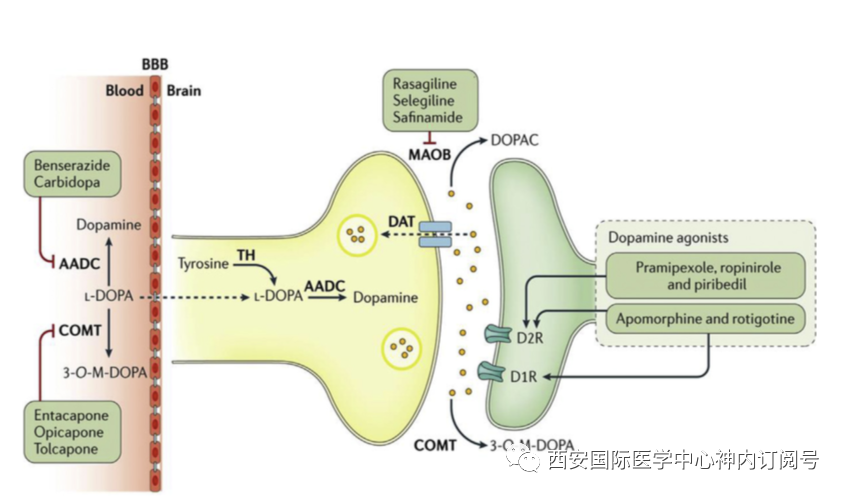 图1:黑质纹状体多巴胺突触的示意图,显示了多巴胺能药物治疗PD运动症状的部位和作用方式;AADC,芳香族氨基酸脱羧酶;BBB,血脑屏障;COMT,儿茶酚-O-甲基转移酶;DOPAC,3,4-二羟基苯乙酸;MAO-B,单胺氧化酶B;TH,酪氨酸羟化酶。(Poewe W, Seppi K, Tanner CM, et al. Parkinson disease. Nat Rev Dis Prim. 2017;3:1-21;)