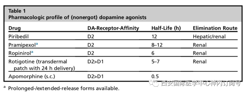 左旋多巴左旋多巴是多巴胺的芳香氨基酸前体,与多巴胺不同,它能够穿过血脑屏障,在中枢芳香族氨基酸脱羧酶(AADC)的作用下,转化为多巴胺。这一过程发生在残存的黑质纹状体投射神经元上,影响突触前膜神经递质的储存和释放,但也可能发生在5-羟色胺能神经元中,导致纹状体中无调节突触多巴胺释放。20世纪60年代,左旋多巴可以显著改善帕金森病运动症状被人们所发现,此后的多个随机对照试验证实了该药控制早期帕金森病运动症状的疗效。直到目前为止,可能除了多巴胺激动剂阿朴吗啡以外,还没有发现任何药物能与左旋多巴的症状效应相媲美。口服左旋多巴制剂与非脑渗透抑制剂AADC(卡比多巴或苄丝肼)的组合剂型,可以提高中枢生物利用度,减少外周多巴胺能副作用,特别是恶心。标准口服左旋多巴制剂的半衰期很短,约90分钟,需要每天多次给药,而肠道吸收主要发生在十二指肠和空肠近端,这使得全身性给药容易受到胃排空延迟或膳食氨基酸竞争空肠吸收的影响。这些外周药代动力学因素加在一起会引起左旋多巴血浆水平的波动,这是长期治疗导致运动反应波动的主要原因。目前已研发出左旋多巴的不同口服缓释制剂,以提供更连续的药物输送,并在许多国家被许可用于治疗运动波动,并有几种新的方法正在临床研发中。此外,左旋多巴/卡比多巴肠凝胶制剂可用于经皮内镜胃造口术持续肠道输送,适用于对口服疗法难以治疗的运动并发症患者(请参阅下文“左旋多巴诱发的运动并发症的治疗”部分)。快速起效的左旋多巴制剂对于需要在关期进行“抢救”的患者很有用(见后面的讨论),左旋多巴/苄丝肼的分散制剂在欧盟有售;最近在美国(Inbrija)批准了用于肺内输送的可吸入粉末制剂。多巴胺激动剂多巴胺激动剂(DAs)是一类通过直接刺激纹状体多巴胺受体而发挥抗帕金森病作用的药物,与D2受体亚族有选择性亲和力。该类的第一个成员是1970年代引入的麦角类化合物溴隐亭,随后是其他几个麦角类制剂(表1)。在报告了麦角类溴隐亭、培高利特和卡麦角林引起的腹膜后、胸膜和心血管纤维化的报道后,它们在很大程度上被新的非麦角类化合物所取代,这很可能与它们在这些组织的成纤维细胞上表达的5-HT2B血清素受体的活性有关。