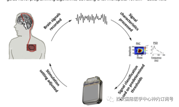图5.自适应DBS 使用双向IPG,可以记录和处理神经信号。当遇到异常信号或达到预定信号阈值时,已编程的算法会触发刺激变化。用于自适应DBS的建议信号包括神经振荡的相位幅度耦合(PAC)和通过功率谱密度(PSD)绘制的自发神经活动。(经Coralie DeHemp-tinne博士许可修改)