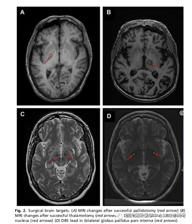 图2.手术靶点 (A)苍白球切开术成功后MRI改变(红色箭头)(B)丘脑切开术成功后MRI改变(红色箭头)(C)双侧丘脑底核的DBS导线部位(红色箭头)(D)双侧苍白球内部的DBS导线部位(红色)箭头)。